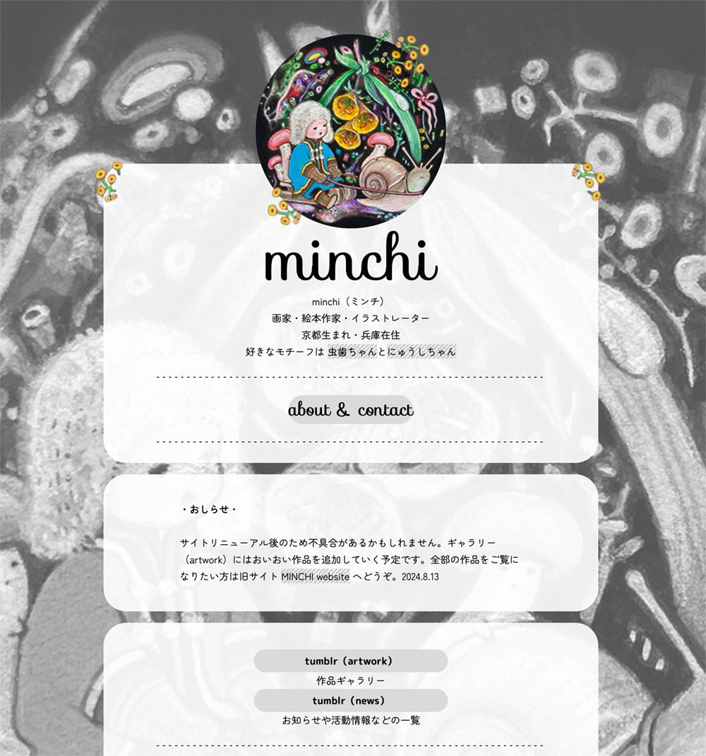 ギャラリー(artwork)と更新情報のまとめブログ(news)は1から設置する元気がなくてtumblrで作りました。tumblrはまだ使い始めたばかりでカスタマイズ方法がよくわかりません。