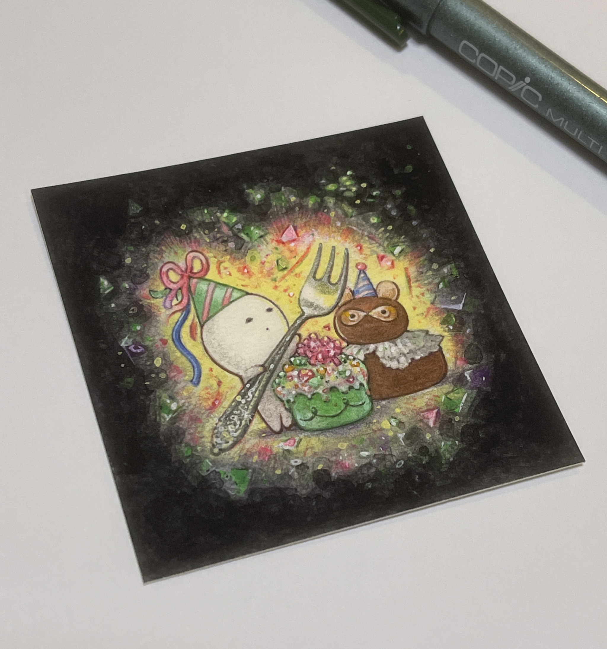 今回は額装したミニサイズのアナログ作品『えいきゅうしちゃんとたぬきケーキ』を出展(販売)します。